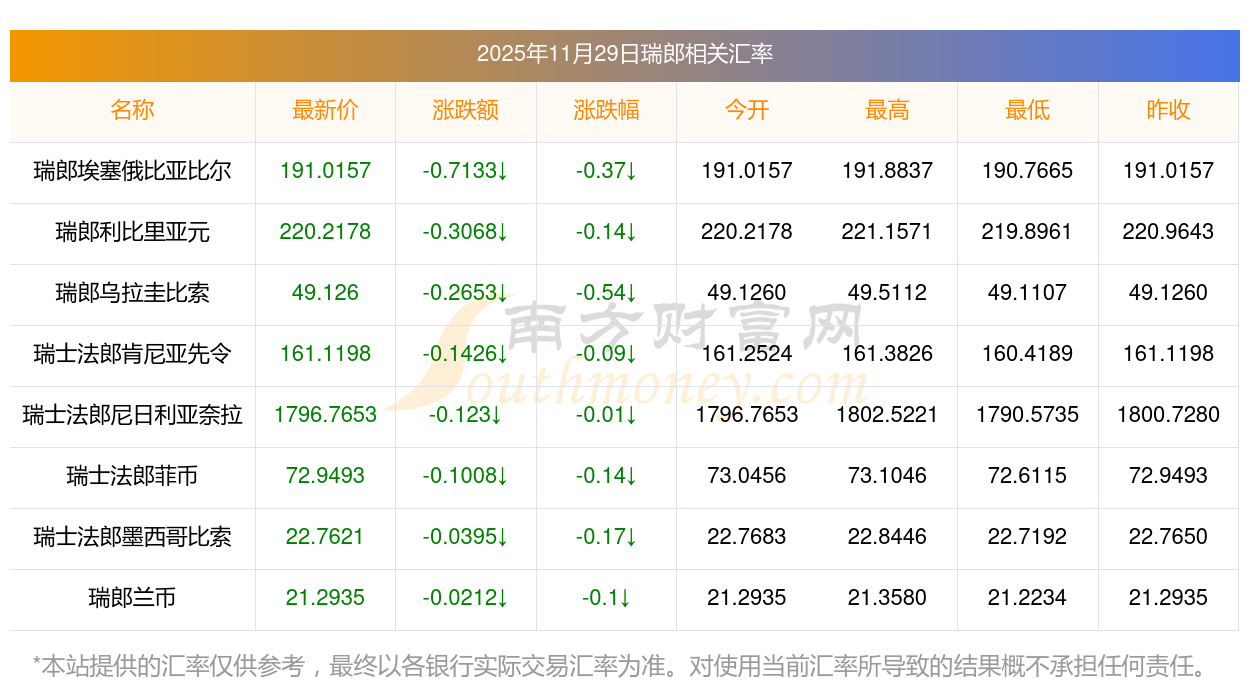 2025年11月29日瑞郎相關(guān)匯率查詢