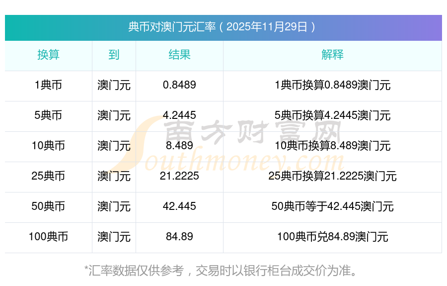 貨幣兌換 | 將典幣轉(zhuǎn)換澳門元匯率計(jì)算表? 2025年11月29日