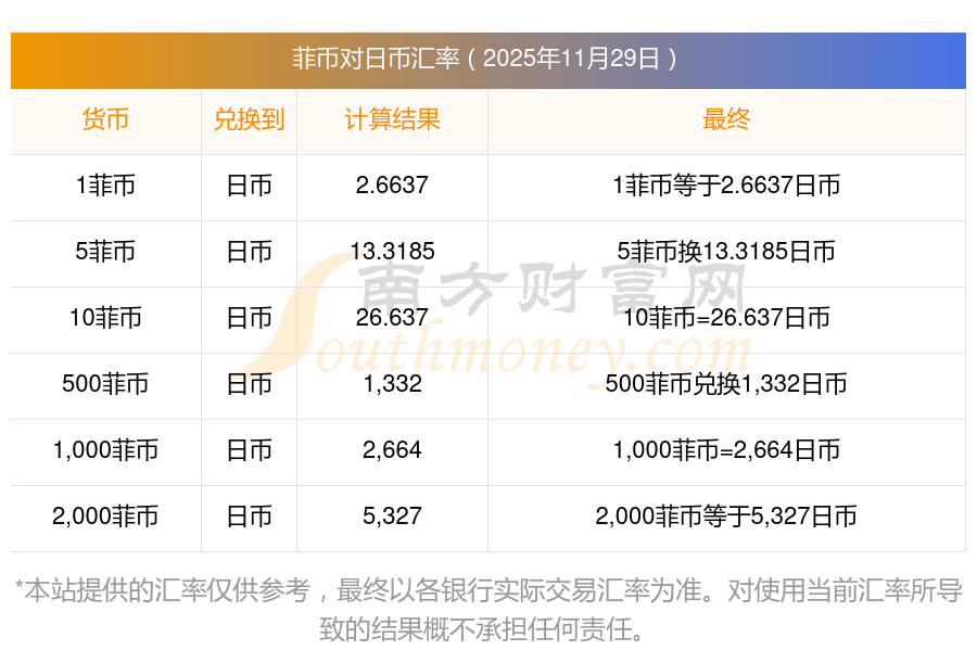 南方財富網(wǎng)為您提供菲幣對日幣匯率最新價格詳情。
