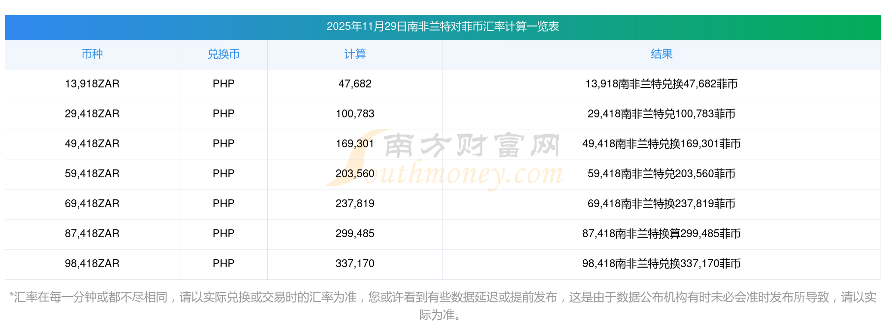 今日25南非蘭特兌換菲幣購匯行情 南非蘭特匯率報價查詢2025-11-29