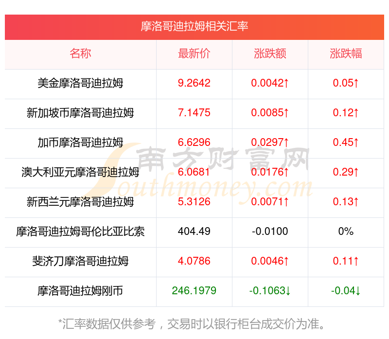 南方財富網(wǎng)為您提供摩洛哥迪拉姆對蘭幣匯率最新價格詳情。
