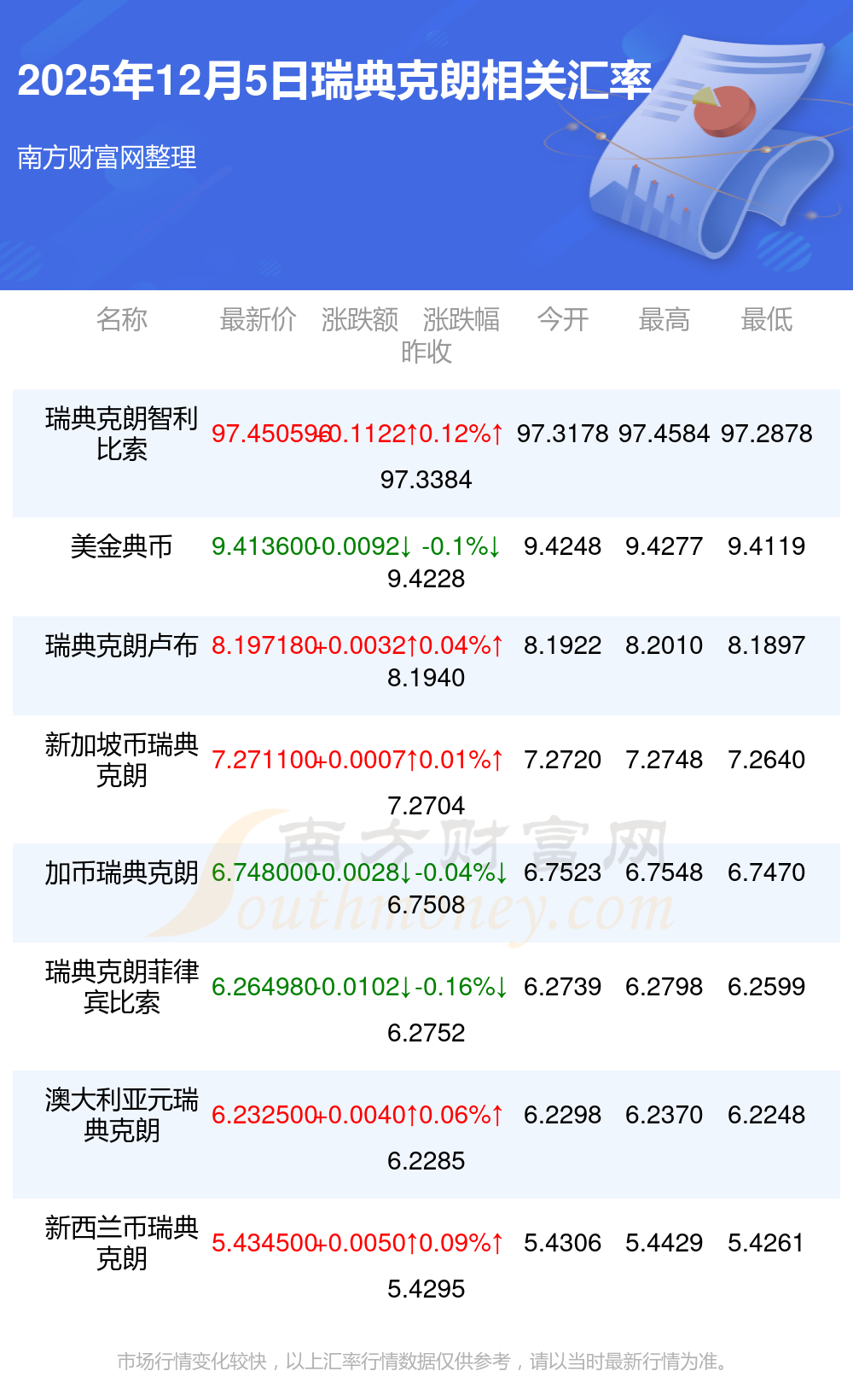 2025年12月5日瑞典克朗相關(guān)匯率查詢