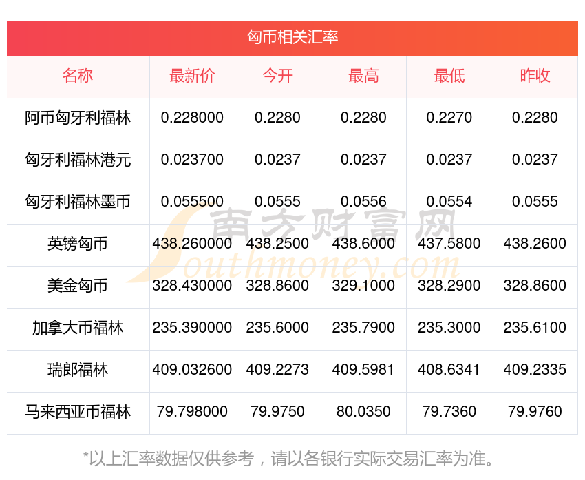 根據(jù)2025年12月5日匯率,匈幣兌換印尼盧比匯率最新價50.734800,今開價50.6151,昨收價50.6143,最高價50.7639,最低價50.5774。