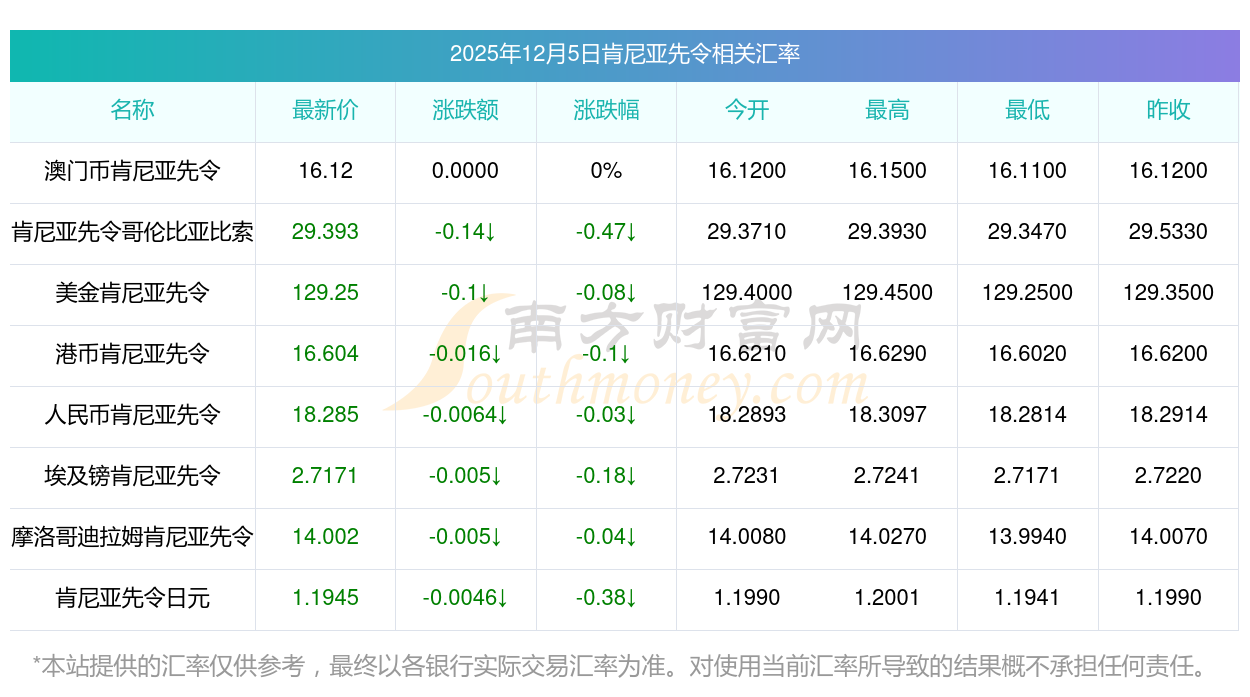 南方財富網(wǎng)為您提供肯尼亞先令對尼日利亞奈拉匯率最新價格詳情。
