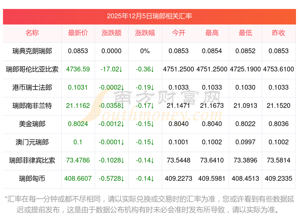 2025年12月5日瑞郎相關(guān)匯率查詢