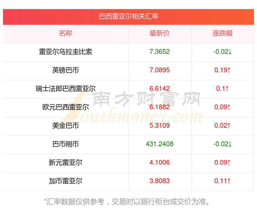 南方財(cái)富網(wǎng)為您提供巴西雷亞爾對韓幣匯率最新價(jià)格詳情。
