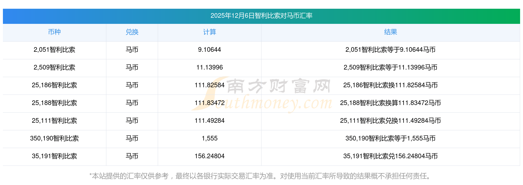 2025年12月6日智利比索與馬幣的兌換匯率計算如下: