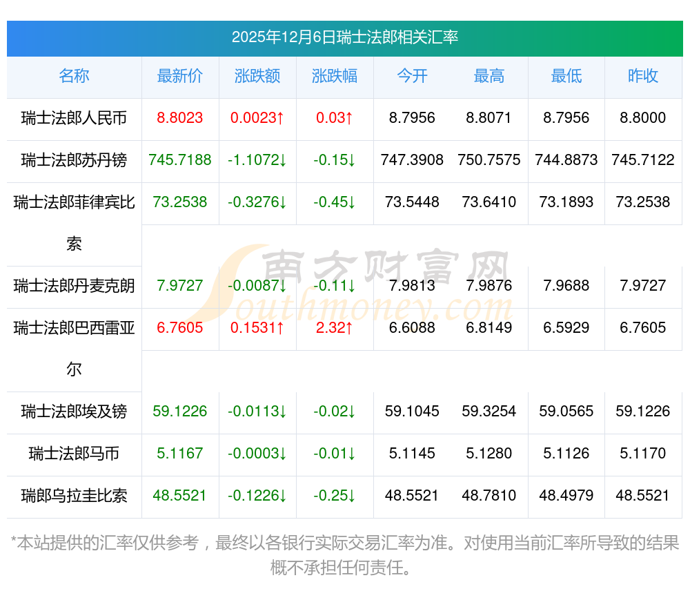 2025年12月6日瑞士法郎相關(guān)匯率查詢