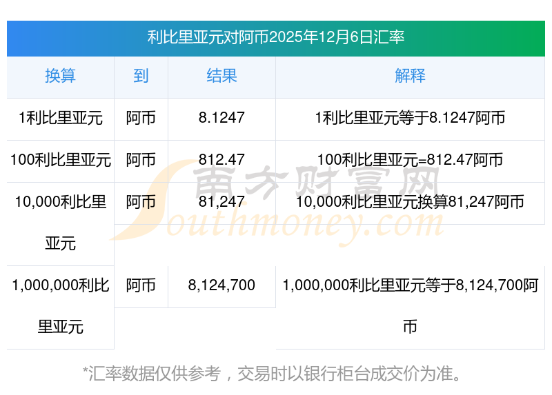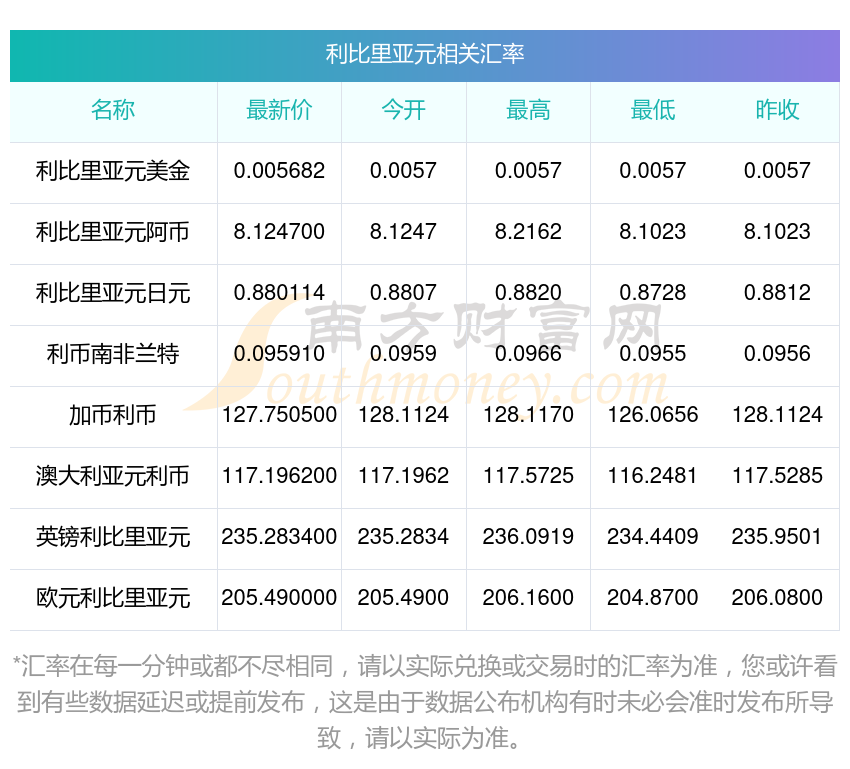 南方財富網(wǎng)為您提供利比里亞元對阿幣匯率最新價格詳情。