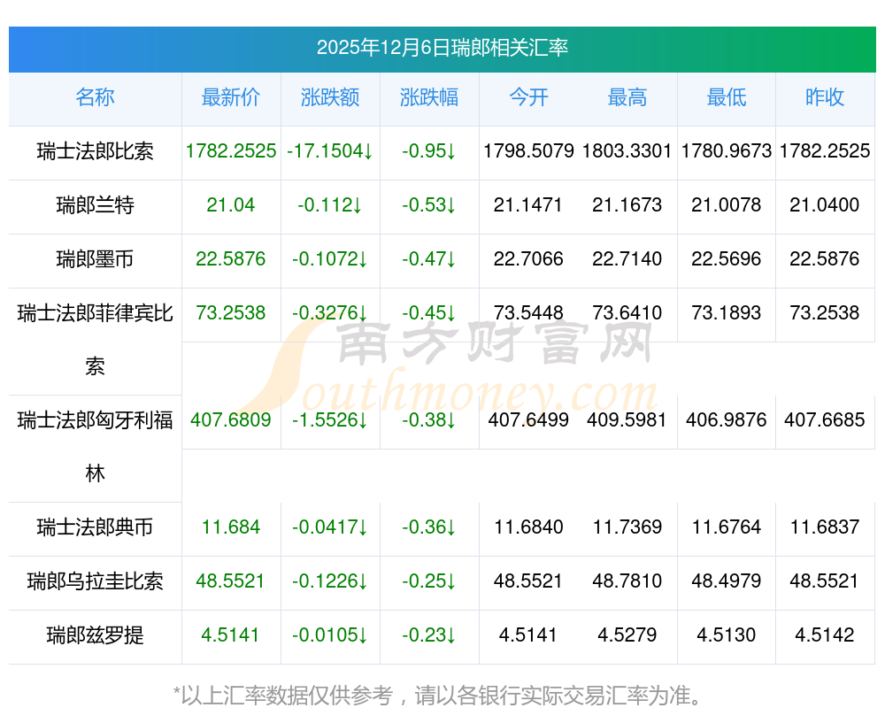 2025年12月6日瑞郎相關(guān)匯率查詢