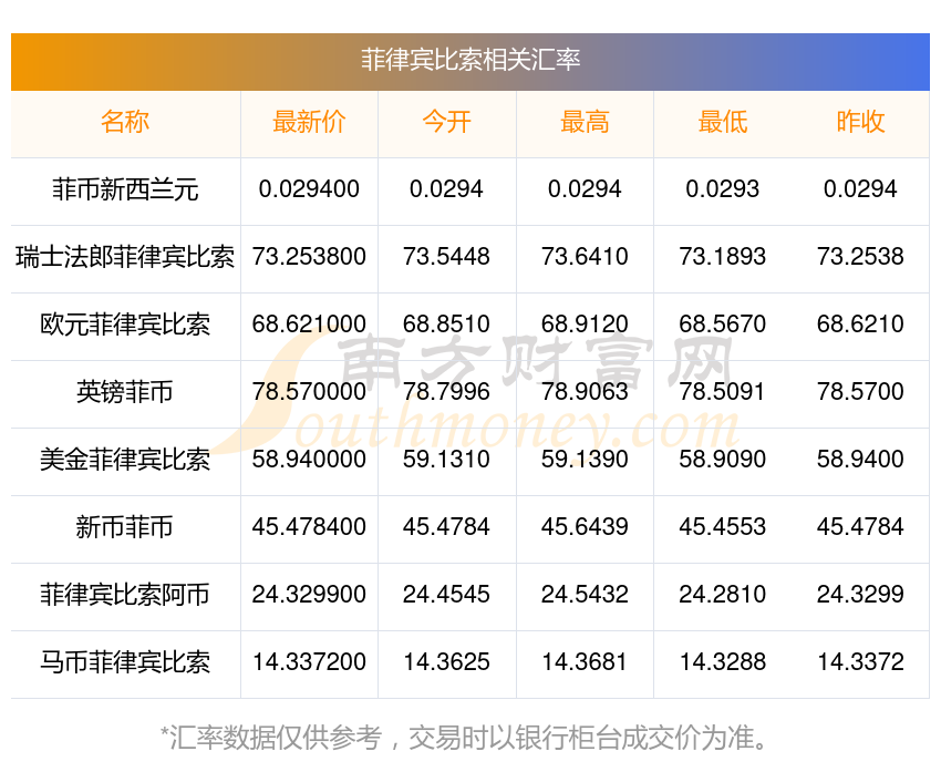 南方財富網(wǎng)為您提供菲律賓比索對秘魯新索爾匯率最新價格詳情。