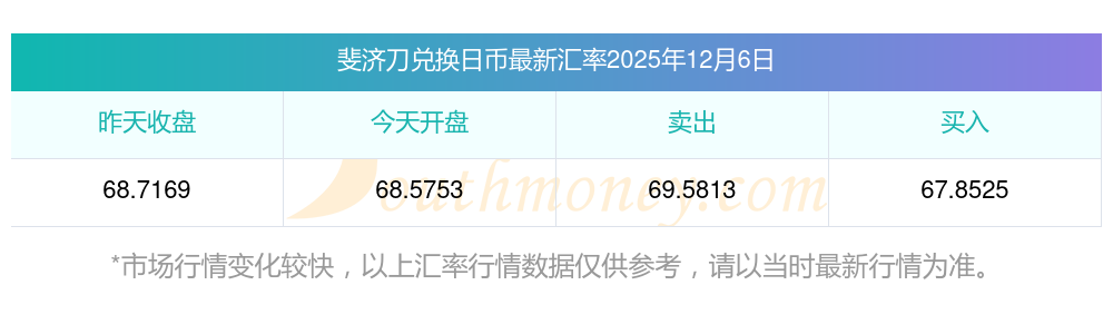 2025年12月6日斐濟(jì)刀兌換日幣匯率是:68.7169