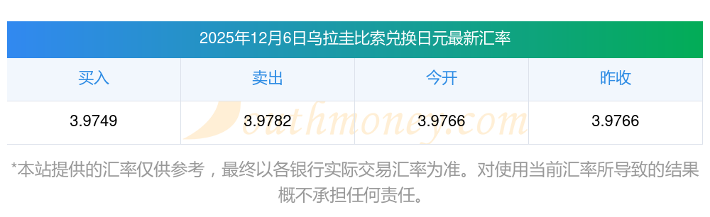 2025年12月6日烏拉圭比索兌換日元匯率是:3.9766