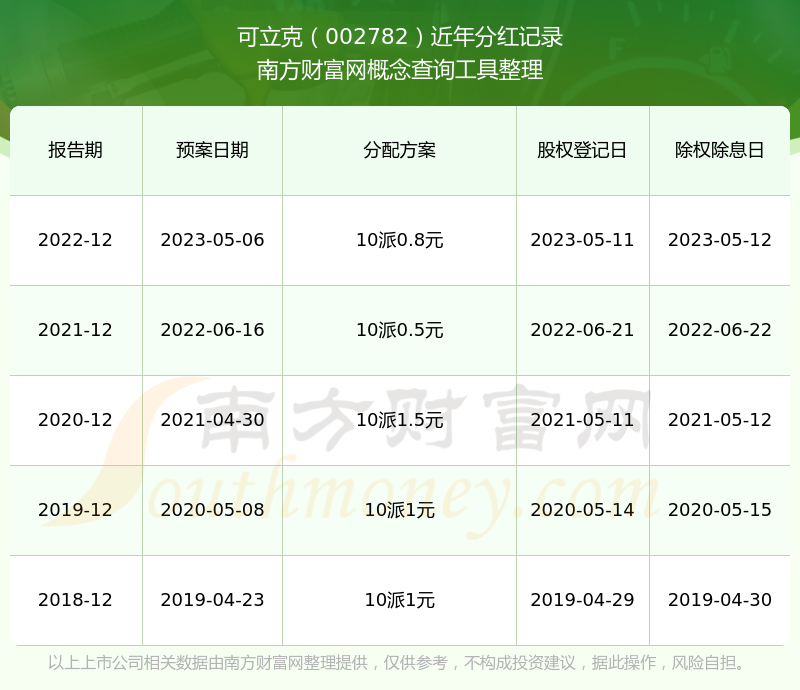 可立克最新一次公布的分紅方案為10派0.8元。本次權(quán)益分派股權(quán)登記日為2023年5月11日,除權(quán)除息日為2023年5月12日,派息日為2023年5月12日。