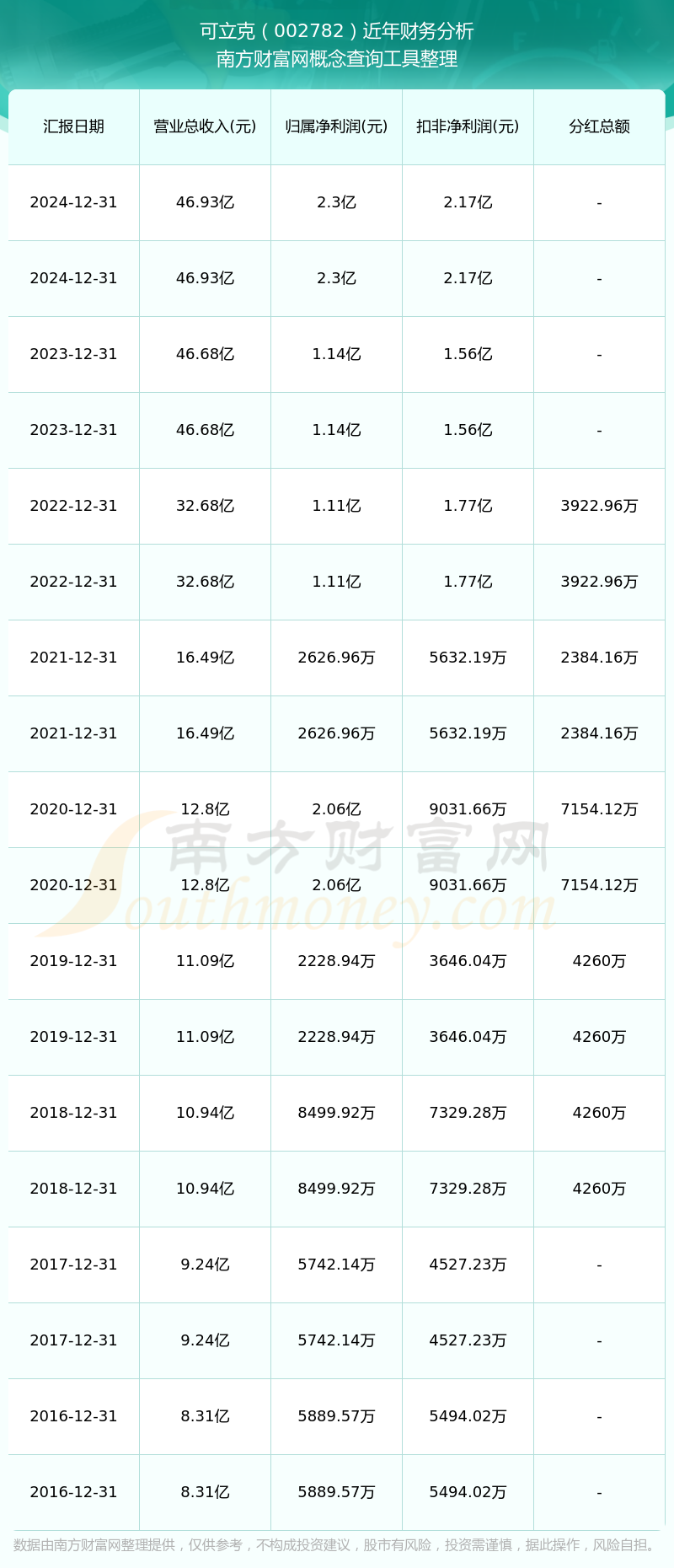 可立克2024年總營(yíng)收46.93億,同比增長(zhǎng)0.54%;凈利潤(rùn)2.3億,同比增長(zhǎng)102.02%;銷(xiāo)售毛利率14%。