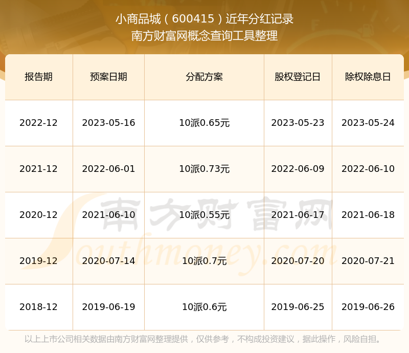 小商品城最新一次公布的分紅方案為10派0.65元。本次權(quán)益分派股權(quán)登記日為2023年5月23日,除權(quán)除息日為2023年5月24日,派息日為2023年5月24日。