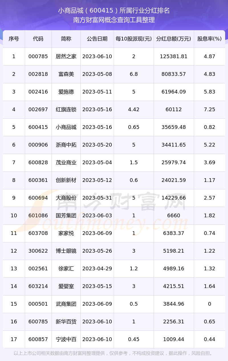 按照南方財富網(wǎng)趨勢選股系統(tǒng)統(tǒng)計,小商品城所屬行業(yè)為商業(yè)百貨行業(yè),商業(yè)百貨行業(yè)分紅排名情況如下表:
