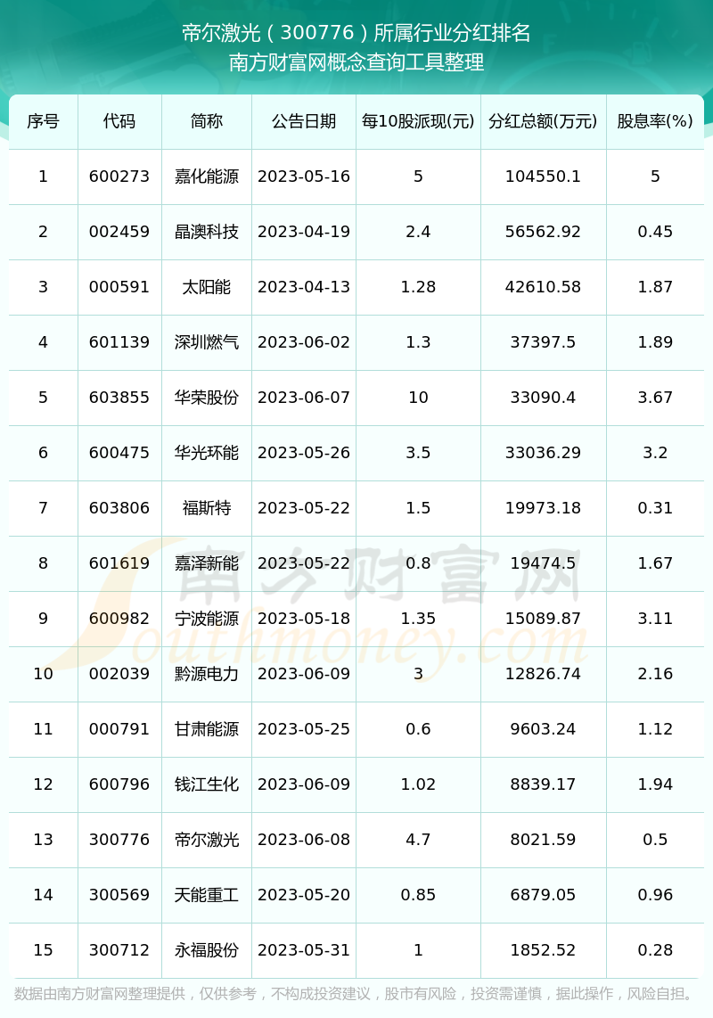 按照南方財富網(wǎng)趨勢選股系統(tǒng)統(tǒng)計,帝爾激光所屬行業(yè)為TOPCon電池行業(yè),TOPCon電池行業(yè)分紅排名情況如下表: