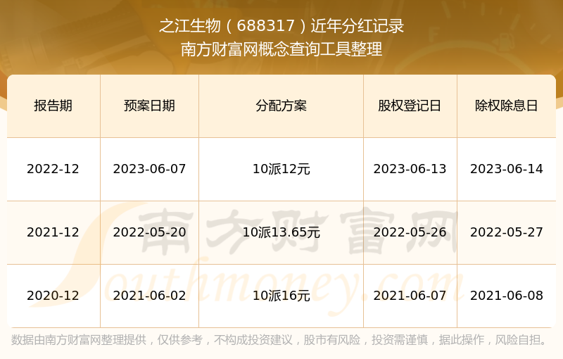 之江生物最新一次公布的分紅方案為10派12元。本次權(quán)益分派股權(quán)登記日為2023年6月13日,除權(quán)除息日為2023年6月14日,派息日為2023年6月14日。