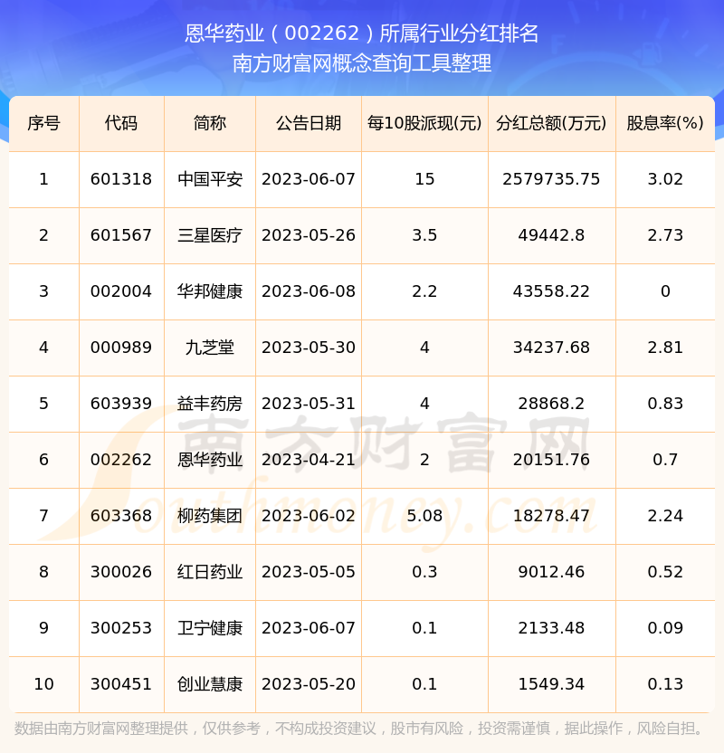 二、恩華藥業(yè)002262行業(yè)分紅排名