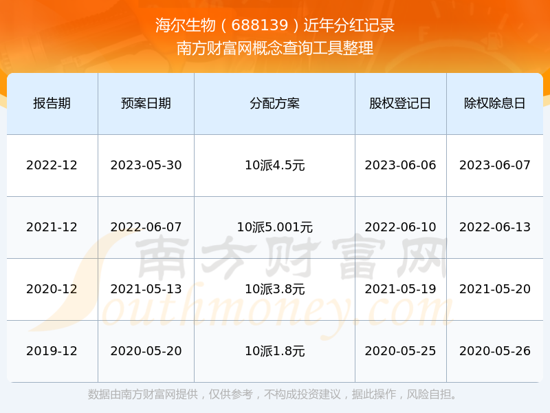 海爾生物最新一次公布的分紅方案為10派4.5元。本次權(quán)益分派股權(quán)登記日為2023年6月6日,除權(quán)除息日為2023年6月7日,派息日為2023年6月7日。