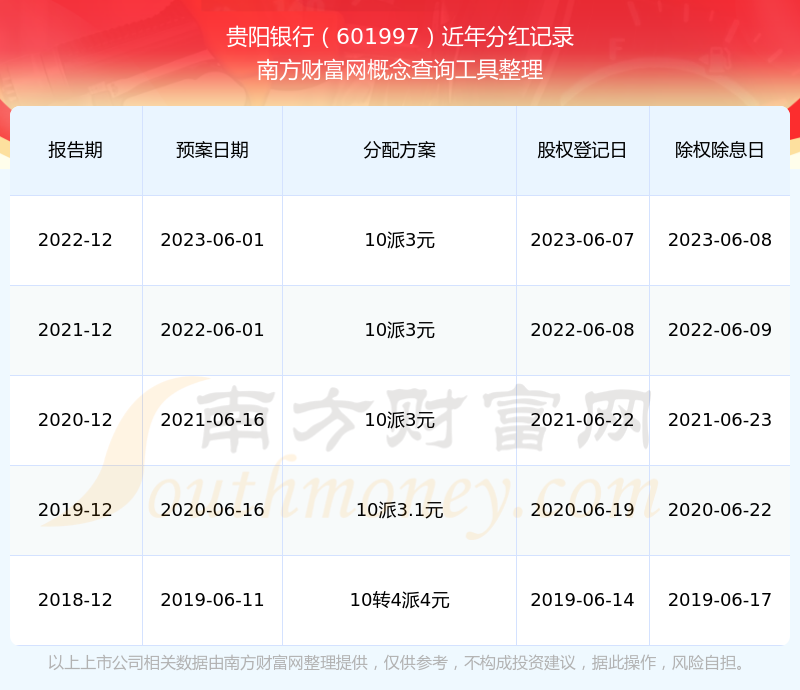 貴陽銀行最新一次公布的分紅方案為10派3元。本次權益分派股權登記日為2023年6月7日,除權除息日為2023年6月8日,派息日為2023年6月8日。