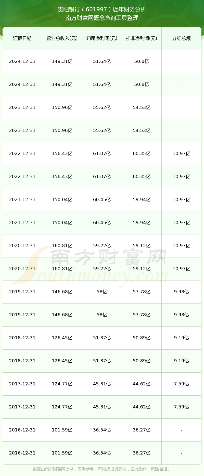 貴陽銀行2024年總營收149.31億,同比增長-1.09%;凈利潤51.64億。