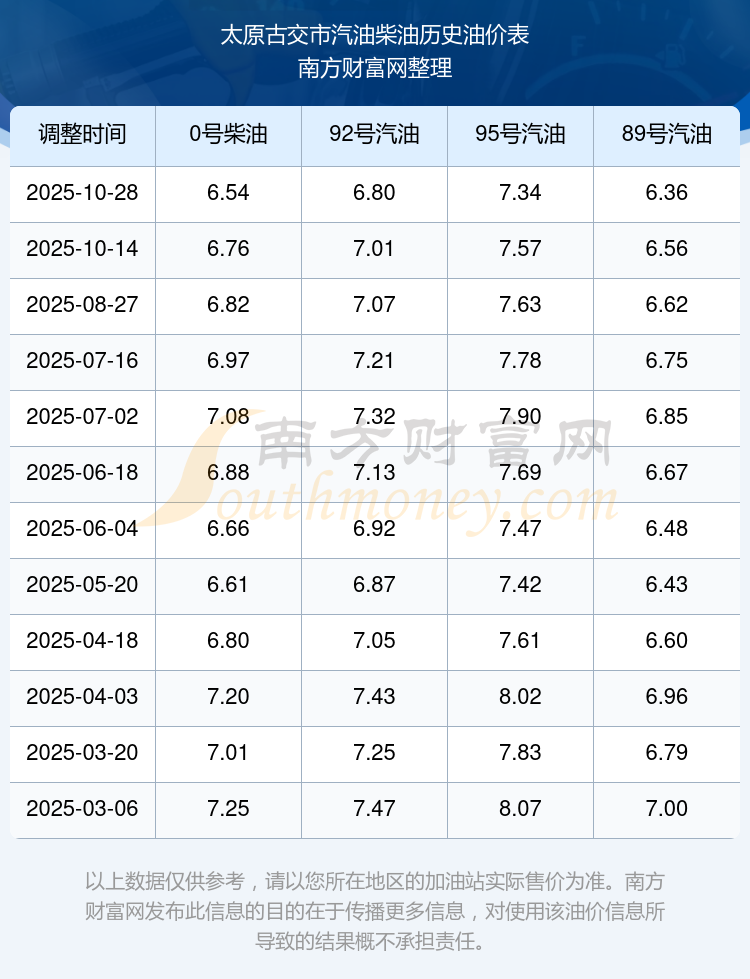 11月2日太原古交市汽油柴最新油價是多少?具體每升為:10月28日調(diào)整后,92號汽油為6.8元,跌了0.21元,跌幅達(dá)3%;95號汽油為7.34元,跌了0.23元,跌幅達(dá)3.04%;89號汽油為6.36元,跌了0.2元,跌幅達(dá)3.05%;0號柴油為6.54元,跌了0.22元,跌幅達(dá)3.25%。