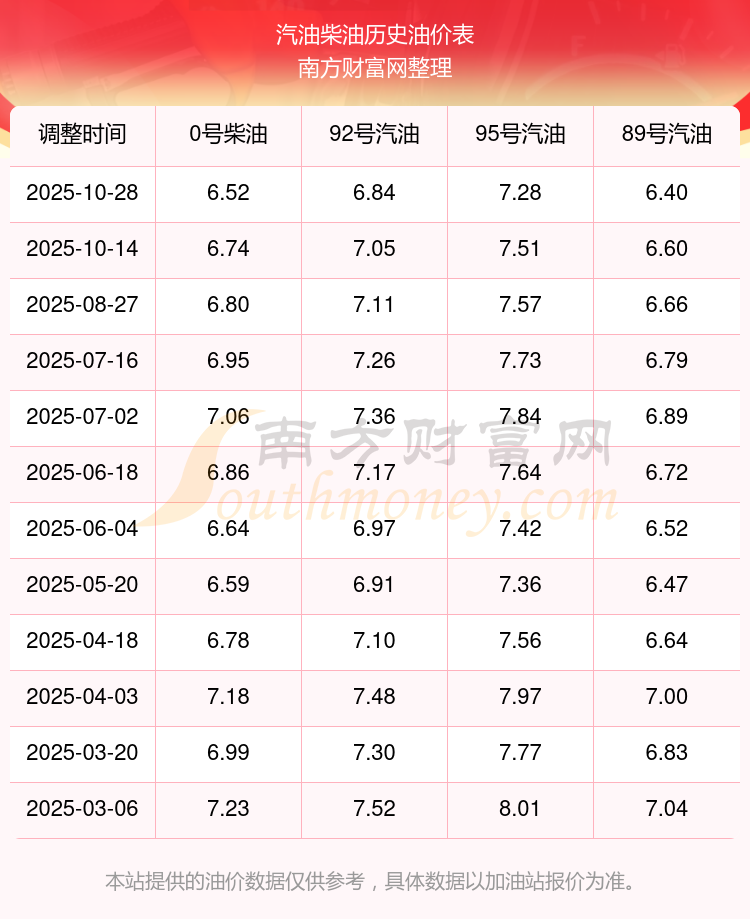 北京房山92號汽油11月2日的價格為10月28日調(diào)整后的價格,具體為6.84元/升,相對上次調(diào)整下調(diào)了0.21元。下一輪油價調(diào)整時間11月10日24時,距離現(xiàn)在還有8.95天。