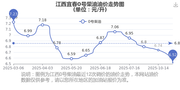 江西宜春0號(hào)柴油11月2日的價(jià)格為10月28日調(diào)整后的價(jià)格,具體為6.52元/升,相對上次調(diào)整下跌了0.22元。