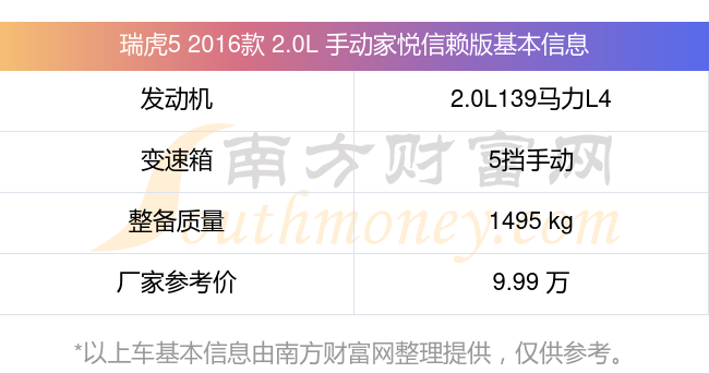 瑞虎5 2016款 2.0L 手動家悅信賴版動力上搭載的是一臺2.0L139馬力L4自然吸氣發(fā)動機,匹配5擋手動擋變速箱,燃料形式為汽油,常規(guī)整備質量1495kg,廠家參考價9.99萬元。