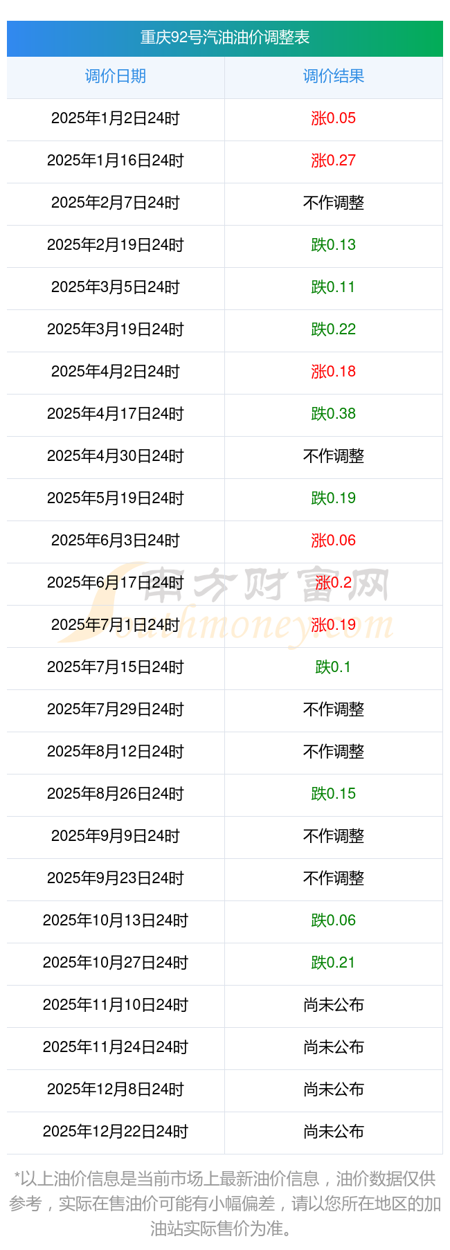 重慶92號(hào)汽油油價(jià)調(diào)整表
