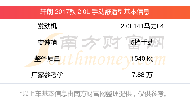 在動力上,軒朗 2017款 2.0L 手動舒適型配備的是一臺2.0L141馬力L4自然吸氣發(fā)動機,匹配的是5擋手動擋變速箱,燃料形式為汽油,常規(guī)整備質(zhì)量1540kg,廠家參考價7.88萬元。