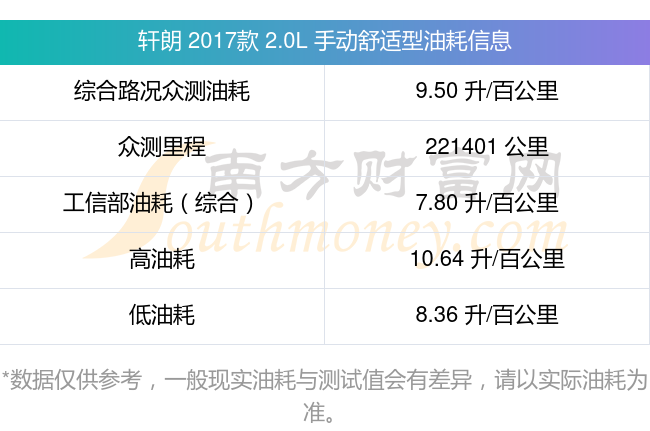 根據(jù)車主實測數(shù)據(jù),該車型低油耗為8.36升每百公里,高油耗為10.64升每百公里,綜合路況眾測油耗為9.50升每百公里,工信部綜合油耗為7.80升每百公里。