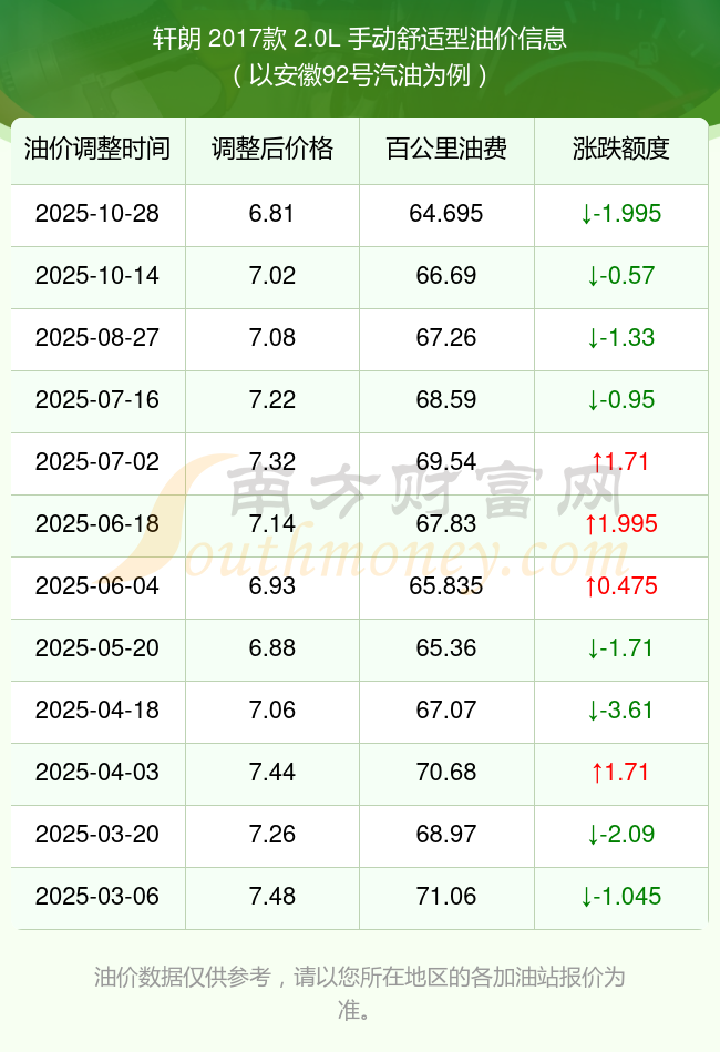 根據(jù)10月28日92號汽油最新調(diào)整價格6.81元/升來計算(以安徽為例),該車型每百公里的平均油費是64.695元,上一輪10月14日調(diào)整價格7.02元每升來計算,每百公里的平均油費是66.69元,對比上一輪少花1.995元,下一輪的油價調(diào)整時間是11月10日24時。