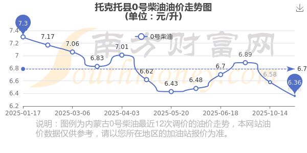 托克托縣0號柴油11月2日的最新價格(10月28日油價調(diào)整后的價格):托克托縣0號柴油6.36元/升,相對上次調(diào)整時間10月14日的油價6.58元每升,減了0.22元,減3.343%。