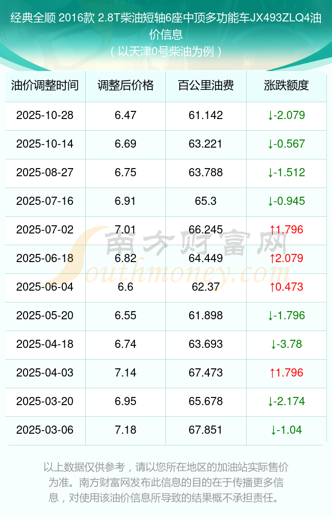 依照10月28日0號(hào)柴油最新調(diào)整價(jià)格6.47元/升來計(jì)算(以天津?yàn)槔?,該車型百公里的平均油費(fèi)是61.142元,依照上一輪10月14日調(diào)整價(jià)格6.69元/升來計(jì)算,百公里的平均油費(fèi)是63.221元,對(duì)比上一輪少花2.079元,下一輪的油價(jià)調(diào)整時(shí)間11月10日24時(shí)。