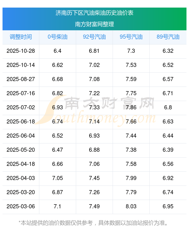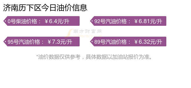 濟(jì)南歷下區(qū)汽油、柴油11月2日每升的價格是多少?具體為:92號汽油為6.81元,降了0.21元;95號汽油為7.3元,降了0.23元;89號汽油為6.32元,降了0.2元;0號柴油為6.4元,降了0.22元,本輪油價的調(diào)整時間為10月28日。