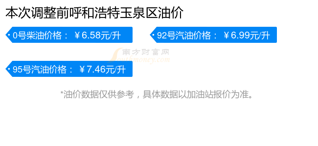 11月2日,呼和浩特玉泉區(qū)汽油、柴油每升最新價格:調整時間為10月28日,92號汽油為6.78元,下跌了0.21元,下跌幅達3%;95號汽油為7.24元,下跌了0.22元,下跌幅達2.95%;0號柴油為6.36元,下跌了0.22元,下跌幅達3.34%。