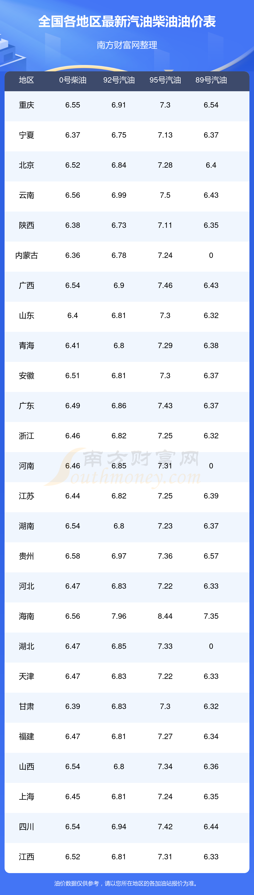 以上數(shù)據(jù)僅供參考,請(qǐng)以您所在地區(qū)的加油站實(shí)際售價(jià)為準(zhǔn)。南方財(cái)富網(wǎng)發(fā)布此信息的目的在于傳播更多信息,對(duì)使用該油價(jià)信息所導(dǎo)致的結(jié)果概不承擔(dān)責(zé)任。