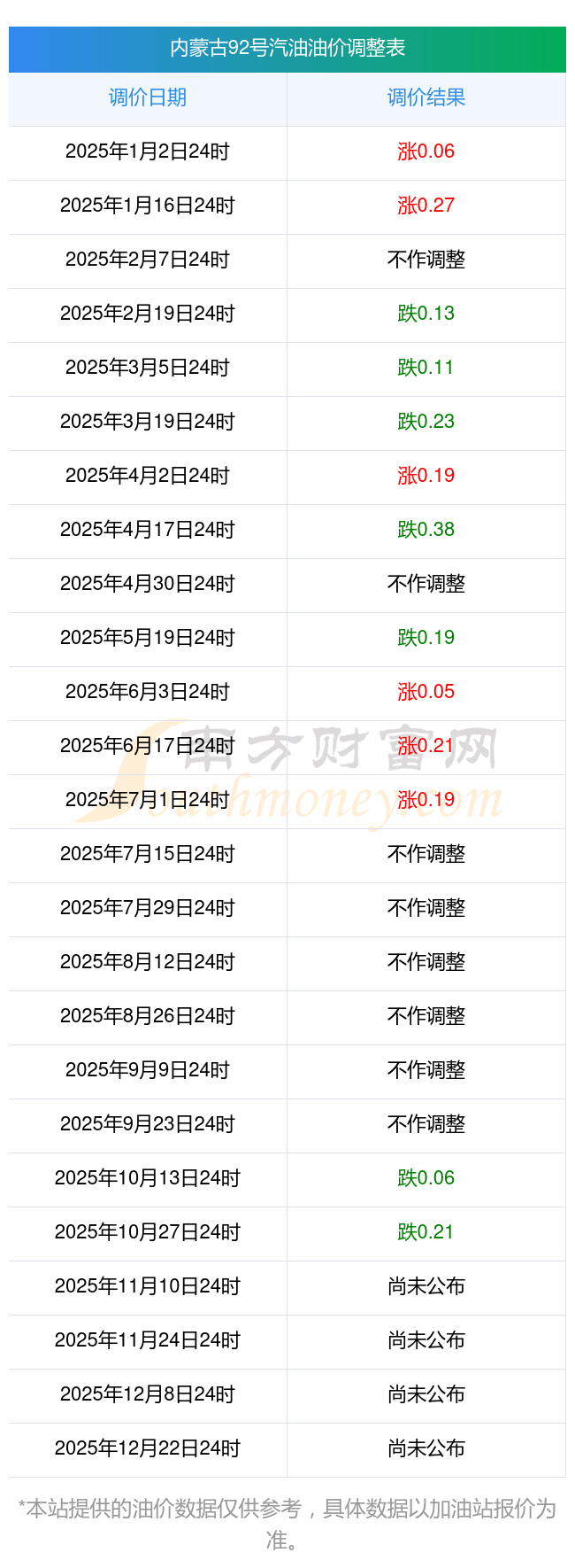 內(nèi)蒙古92號(hào)汽油油價(jià)調(diào)整表