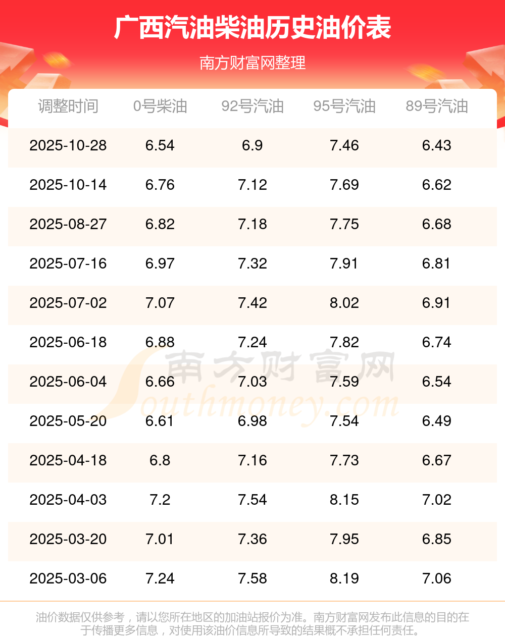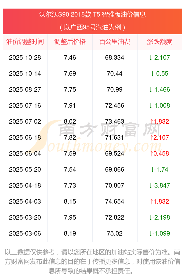按照10月28日95號汽油最新調(diào)整價格7.46元/升來計算(以廣西為例),該車型百公里平均油費(fèi)為68.334元,按照上一輪10月14日調(diào)整價格7.69元/升來計算,百公里平均油費(fèi)為70.44元,對比上一輪少花2.107元,下一輪油價調(diào)整時間為11月10日24時。