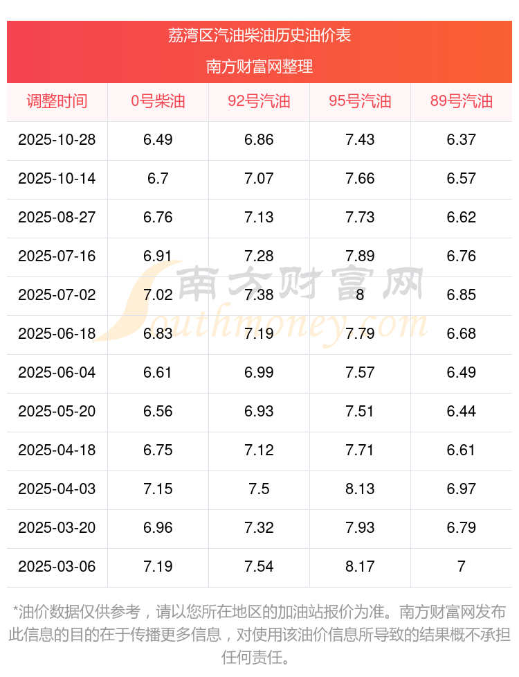 荔灣區(qū)汽油、柴油11月2日每升的價(jià)格為:92號(hào)汽油6.86元;95號(hào)汽油7.43元;89號(hào)汽油6.37元;0號(hào)柴油6.49元,本次油價(jià)調(diào)整時(shí)間是10月28日。