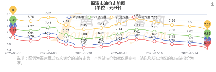 福清市汽油、柴油11月2日的價(jià)格是多少錢一升?詳情為:92號汽油為6.81元,跌了0.21元;95號汽油為7.27元,跌了0.23元;89號汽油為6.34元,跌了0.2元;0號柴油為6.47元,跌了0.22元,本次油價(jià)的調(diào)整時(shí)間為10月28日。
