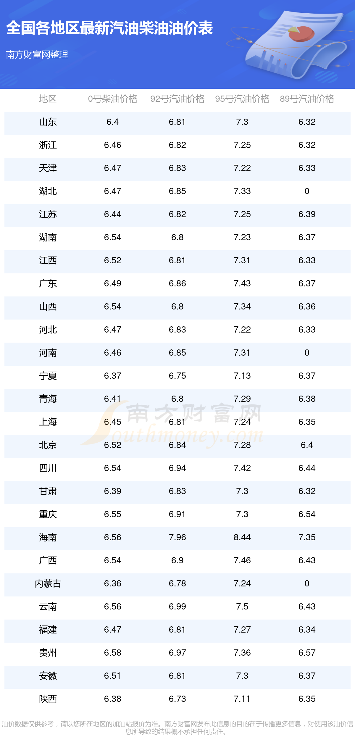 以上數(shù)據(jù)僅供參考,請以您所在地區(qū)的加油站實際售價為準。南方財富網(wǎng)發(fā)布此信息的目的在于傳播更多信息,對使用該油價信息所導致的結(jié)果概不承擔責任。