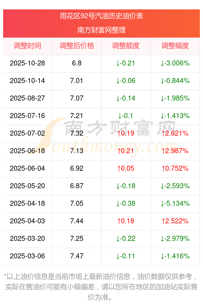 11月2日雨花區(qū)92號汽油歷史油價調(diào)整一覽表