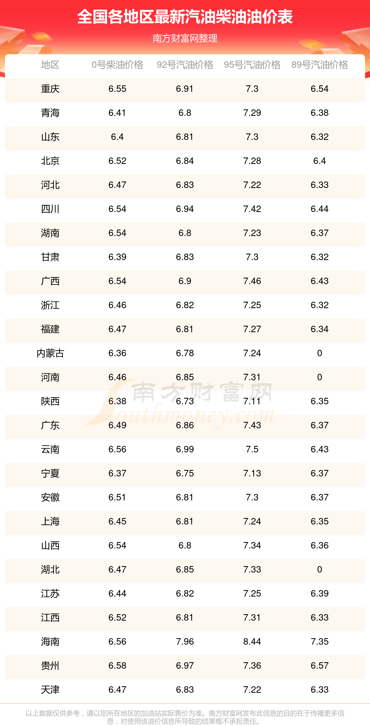 本次油價的調(diào)整時間為10月28日,調(diào)整后全國油價詳情為:92號汽油平均價格為7元每升,其中,最低的是陜西,6.73元每升,最高的是海南,7.96元每升。95號汽油平均價格為7元每升,其中,最低的是陜西,7.11元每升,最高的是海南,8.44元每升。0號柴油平均價格為:6元每升,其中,最低的是內(nèi)蒙古,6.36元每升,最高的是貴州,6.58元每升。89號汽油平均價格為6元每升,其中,最低的是浙江,6.32元每升,最高的是海南,7.35元每升。下一輪油價調(diào)整時間11月10日24時,距離現(xiàn)在還有8.95天。