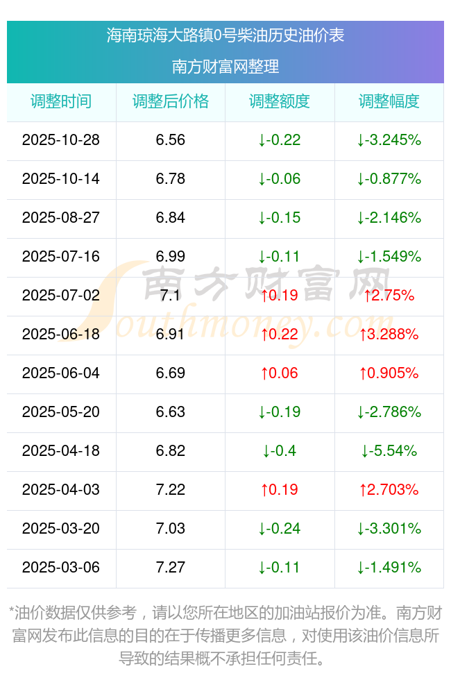 海南瓊海大路鎮(zhèn)0號柴油歷史油價表