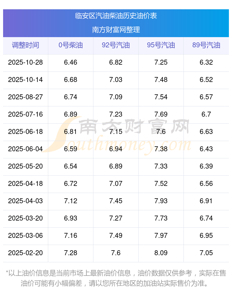 臨安區(qū)歷史油價(jià)表
