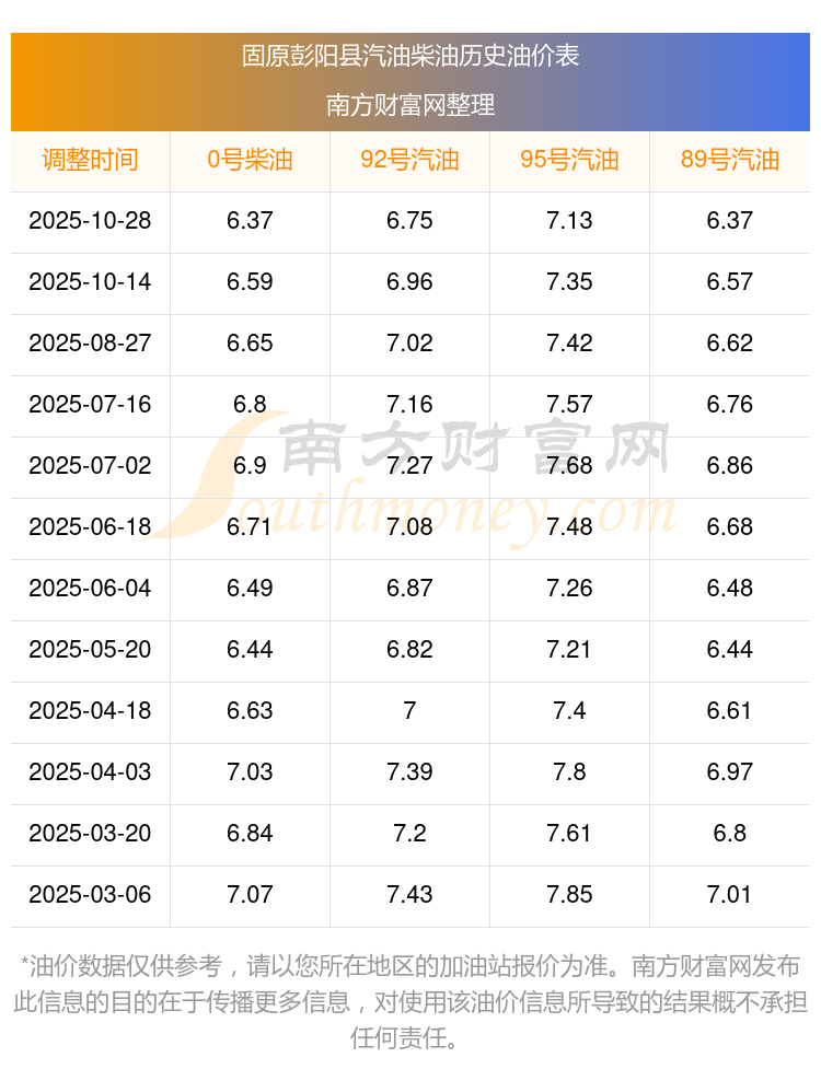 固原彭陽縣歷史油價(jià)表